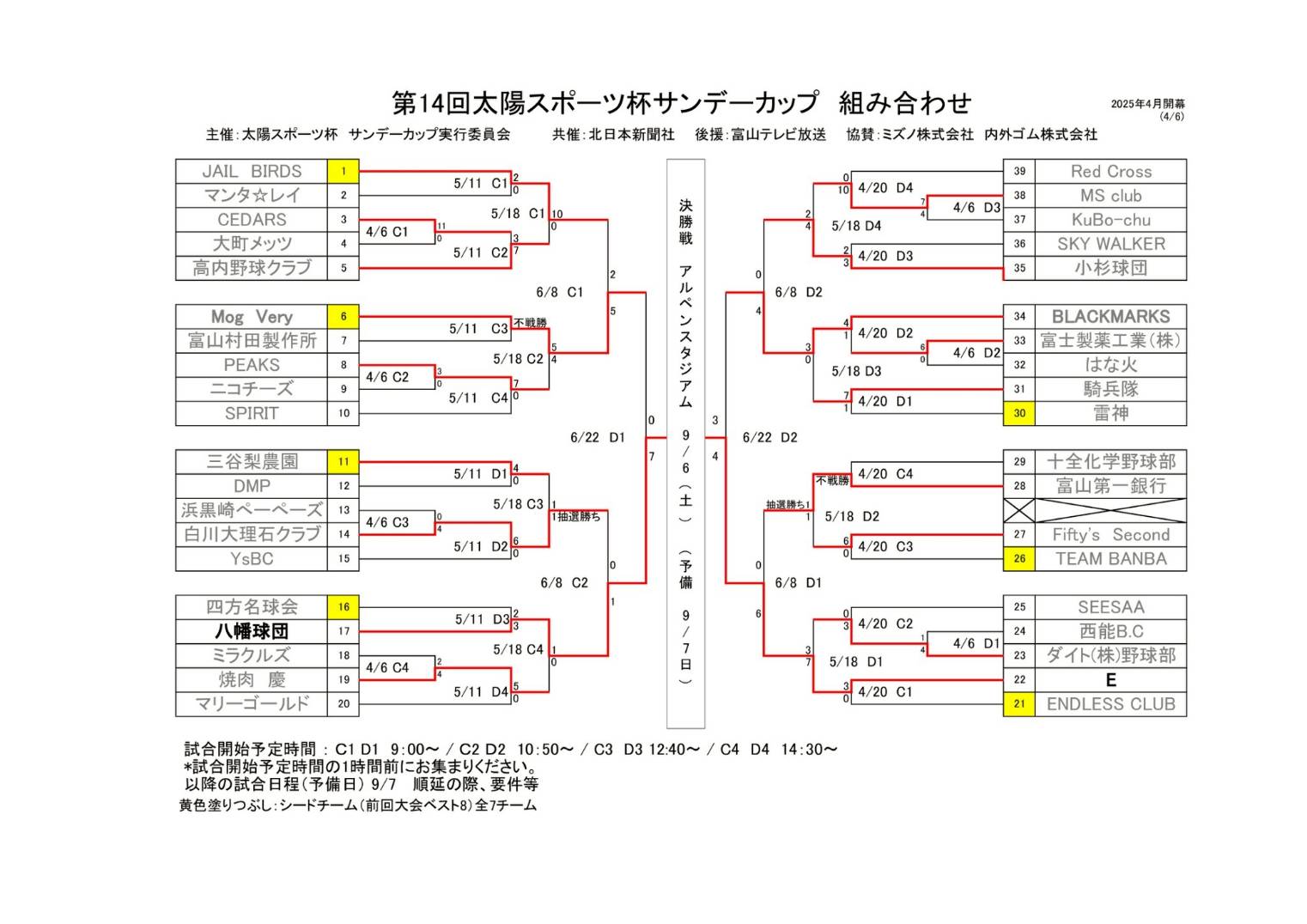 | 22日 | 日 | 第14回太陽スポーツ杯サンデーカップ軟式野球大会 準決勝 | E | 3-4× | 敗北 | Go! | |