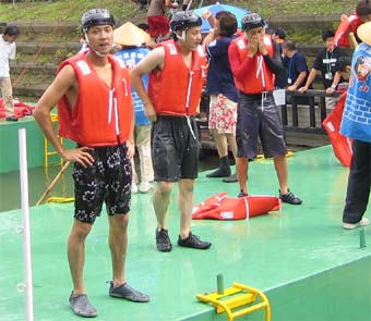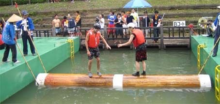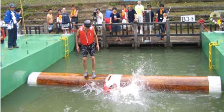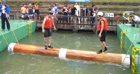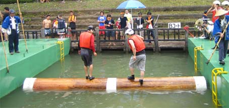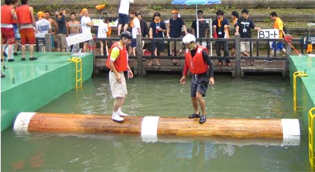 水上の丸太の両端に両チーム各1名が乗り、対戦相手を先に落とした者の勝ちです。