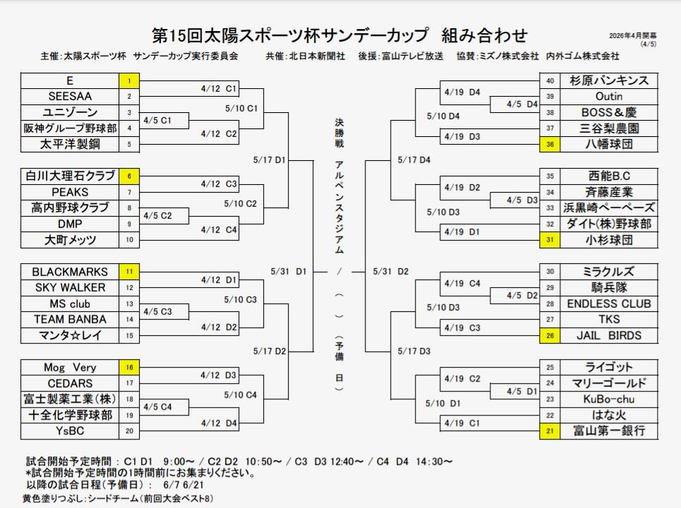 練習 第24回富山県IT杯 代表者会議 &組み合わせ抽選会 第15回太陽スポーツ杯サンデーカップ軟式野球大会 組み合わせ抽選会 練習試合 練習試合 練習試合 |